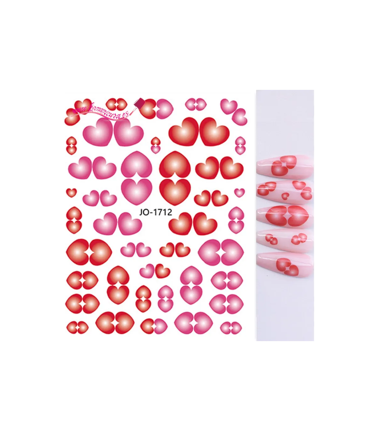 Pegatinas ideales para decorar tus uñas el día de san Valentín. Pegatinas se puede aplicar tanto en las uñas reconstruidas o en esmaltes. Para un mejor sellado se recomienda que, después de la aplicación de la pegatinas de uñas autoadhesivas, le apliques una capa de top coat (Finalizador).
