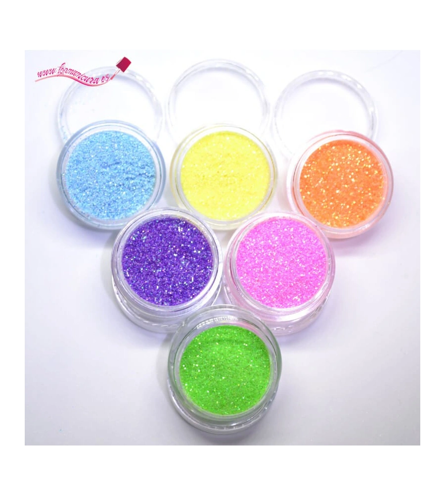 El pack azúcar uñas glitter consiste en 6 botes de 2 Gramos.