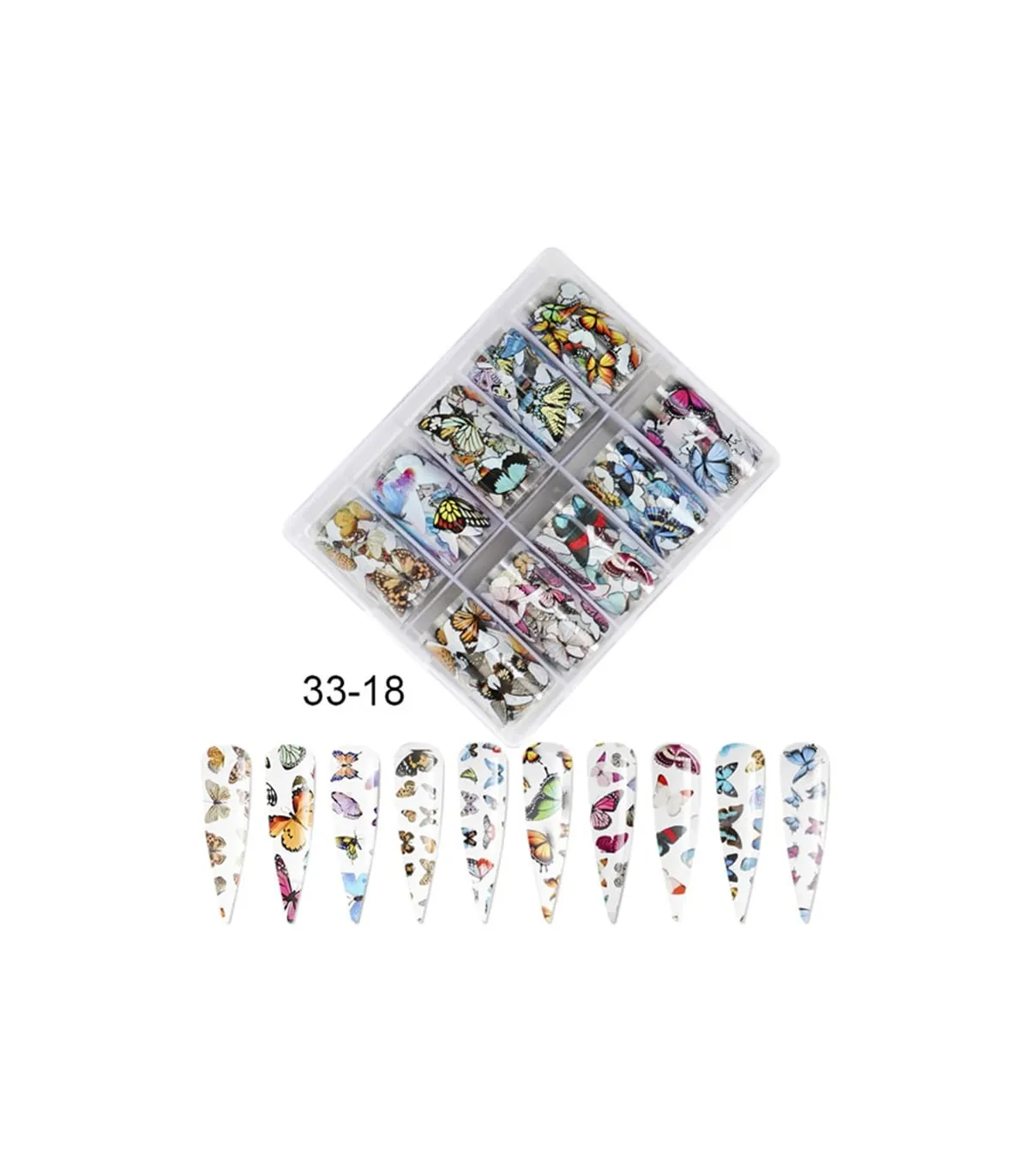 El pack 10 foil uñas mariposas contiene 10 modelos de foil de uñas elegante y hermosa cada modelo tienes 100 cm. Son ideal tanto para DIY arte de uñas como para crear trabajos de manicura hermosos.