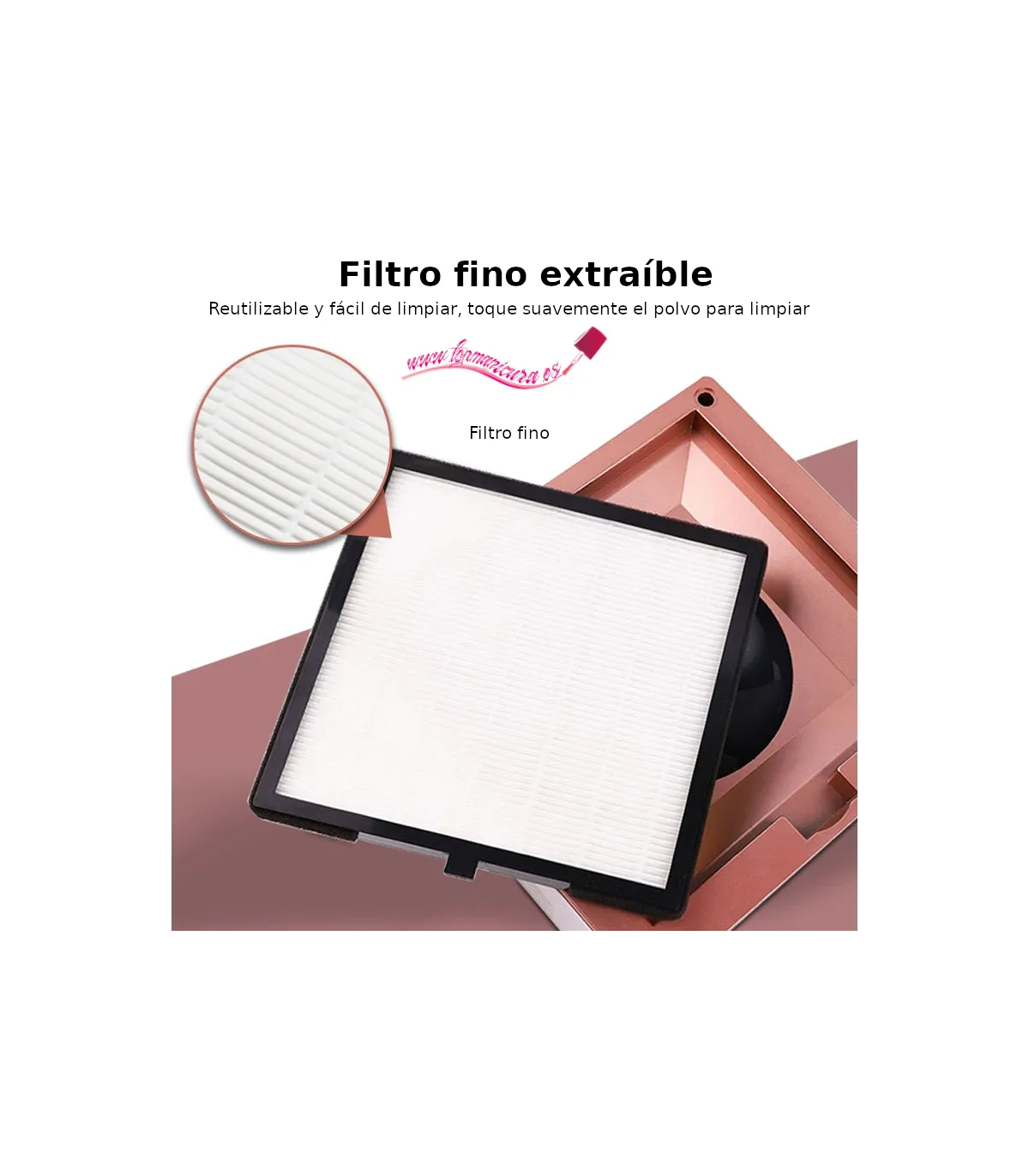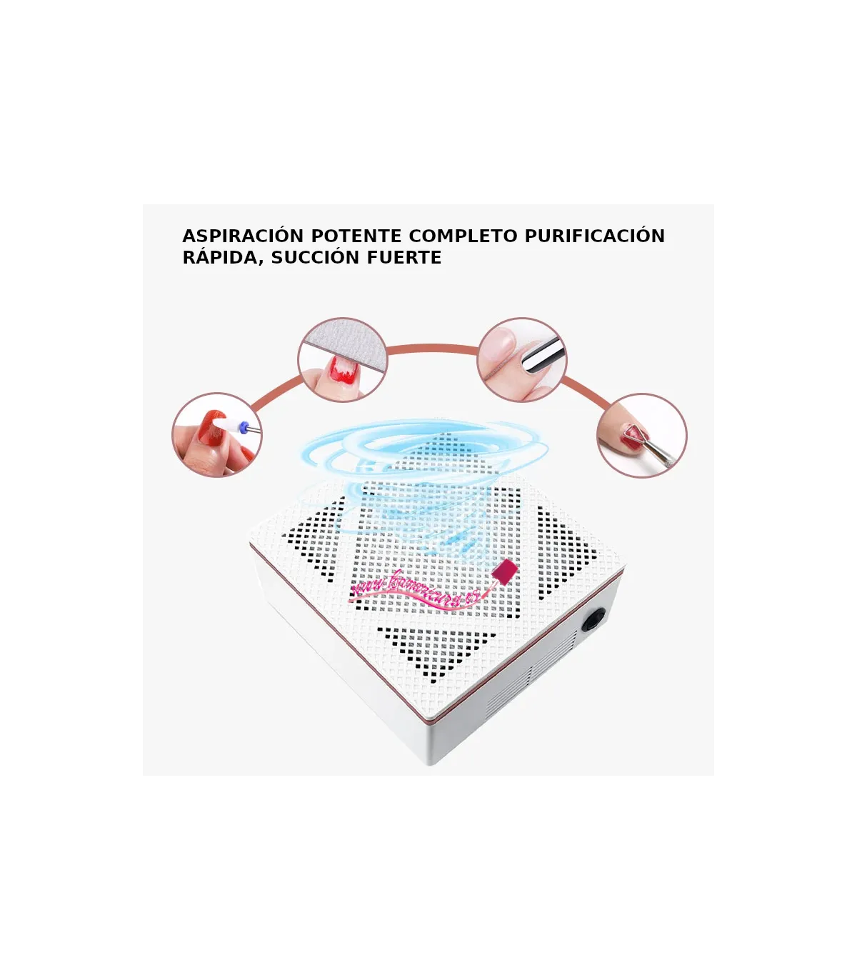 Aspirador de uñas 60W para recoger el polvo de limado de tus uñas. Color blanco que tiene un diseño, elegante y muy funcional. Tiene un filtro que lo hace muy fácil de limpiar y desinfectar. Viene con 1 filtro montado.