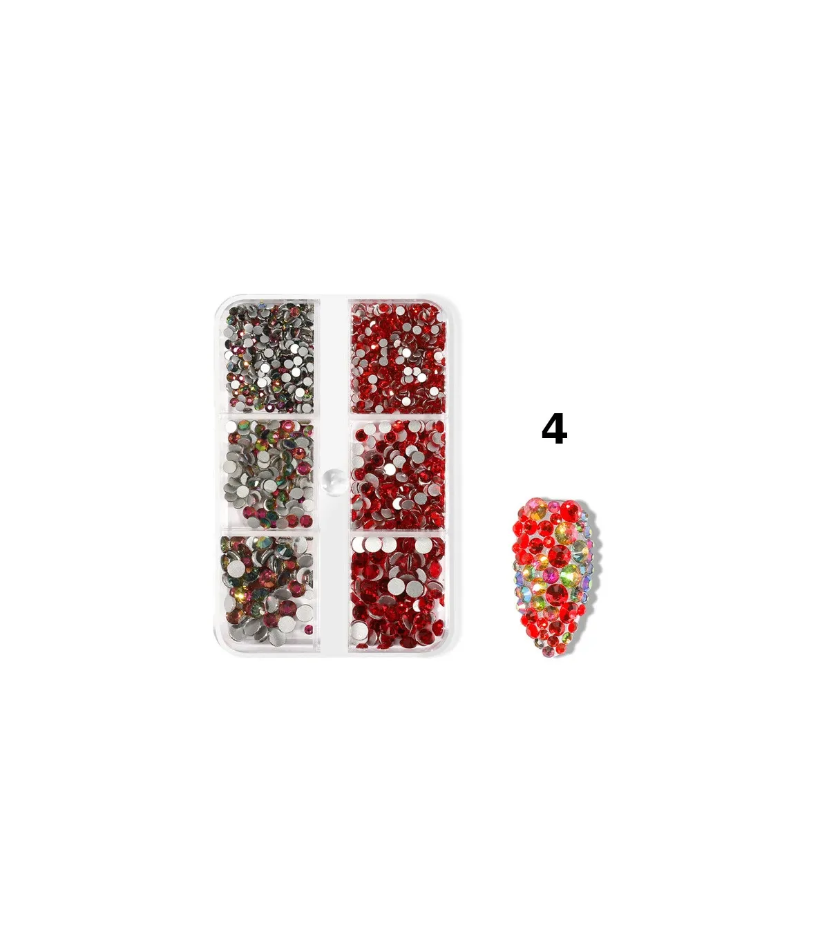 Los mini pack diamantes para uñas contiene 6 tamaños con forma 3D las medidas de los tamaños son 1,5 mm, 2 mm, 2,3 mm, 2.7 mm, 3 mm, 4 mm. diamantes para uñas que son fáciles de aplicar en las uñas, haciendo una buena opción para decorar y dar color a tus uñas.