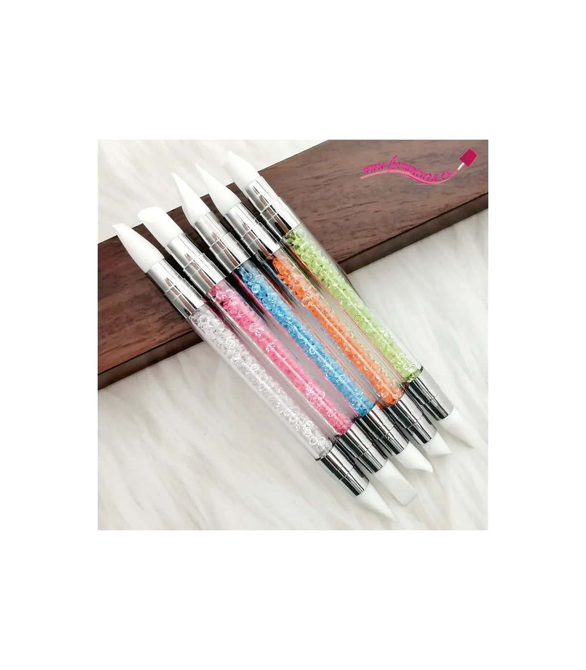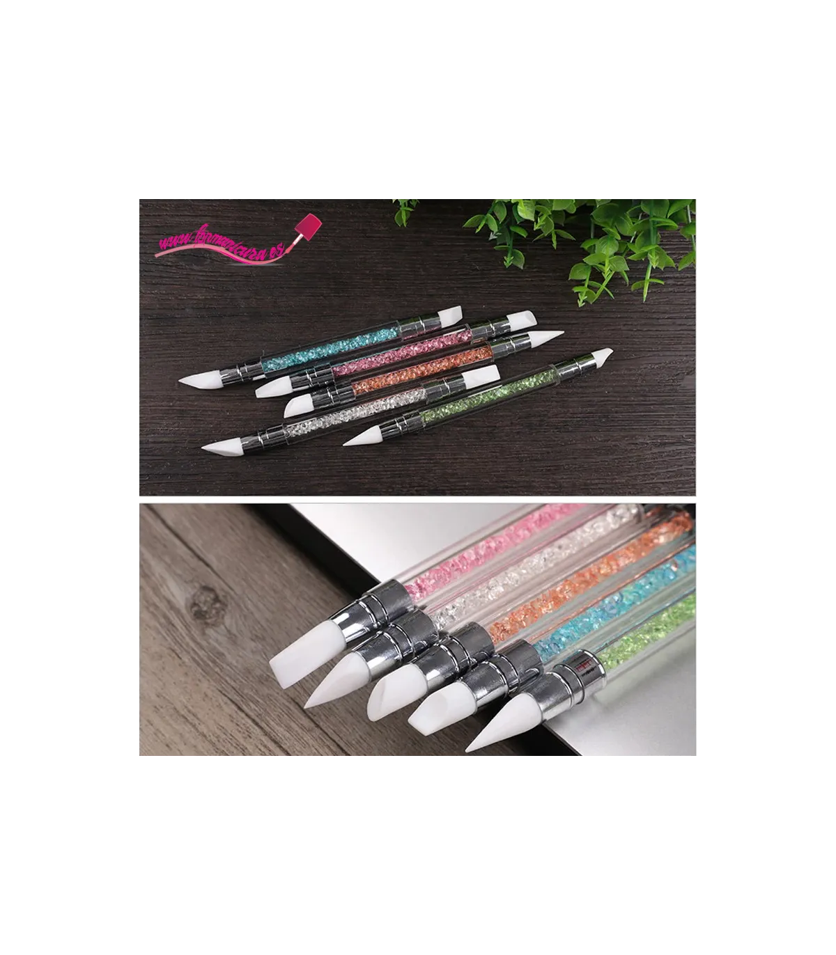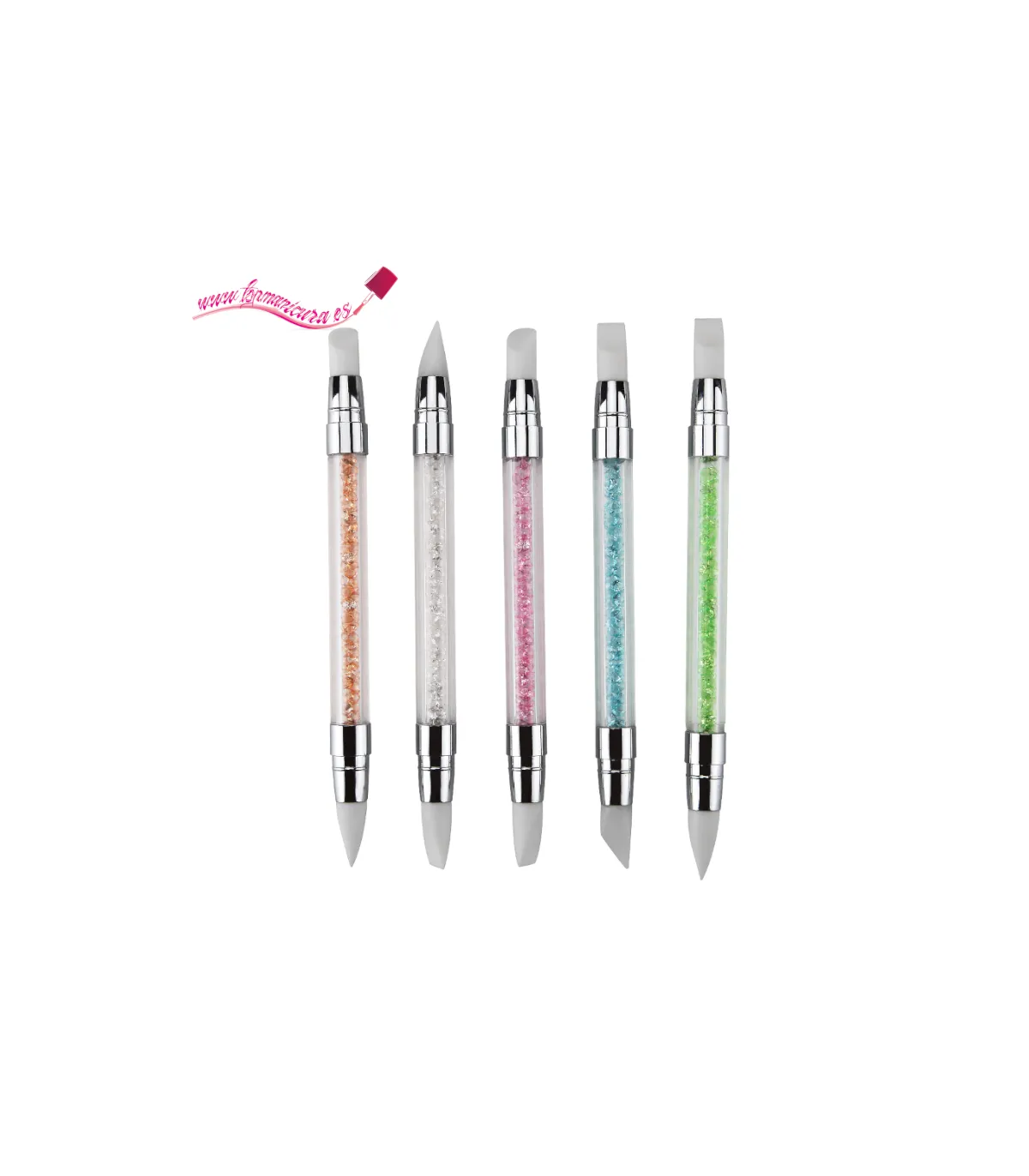 El Diseño del kit pinceles de silicona para uñas es delicado, las puntas de los pinceles son de silicona, tubo acrílico transparente, diamantes de imitación de cristal decorados. Las formas van desde la punta cónica, el cincel angular, el cincel plano, etc.
