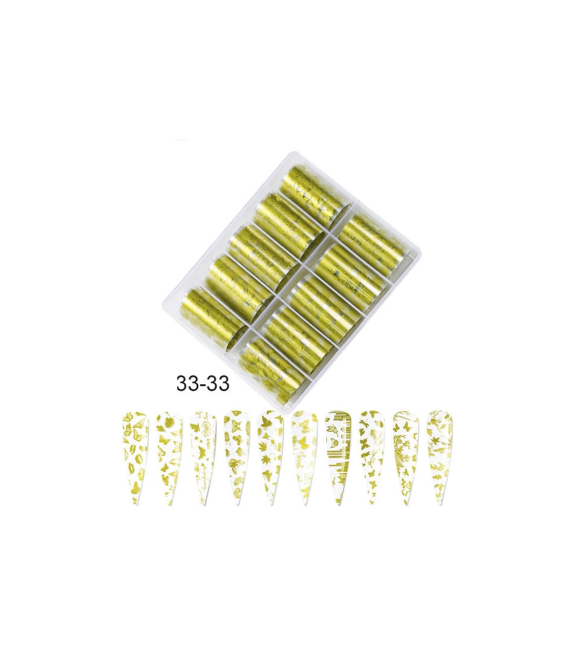 El pack 10 foil uñas dorados contiene 10 modelos de foil de uñas plateados o dorados cada modelo tienes 100cm.