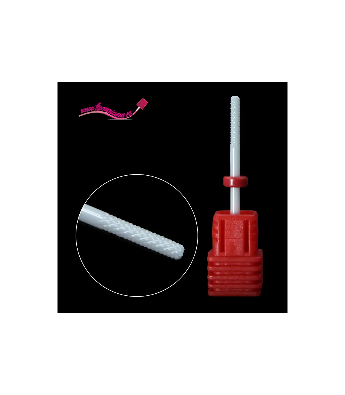 Un fresa de uñas de cerámica extremadamente duradera y de cortes muy precisos, gracias a su forma se usa para limar, retirar y dar forma al Acrílico, Gel, Poly Gel y esmaltado permanente. Tamaño universal para todos los tornos.