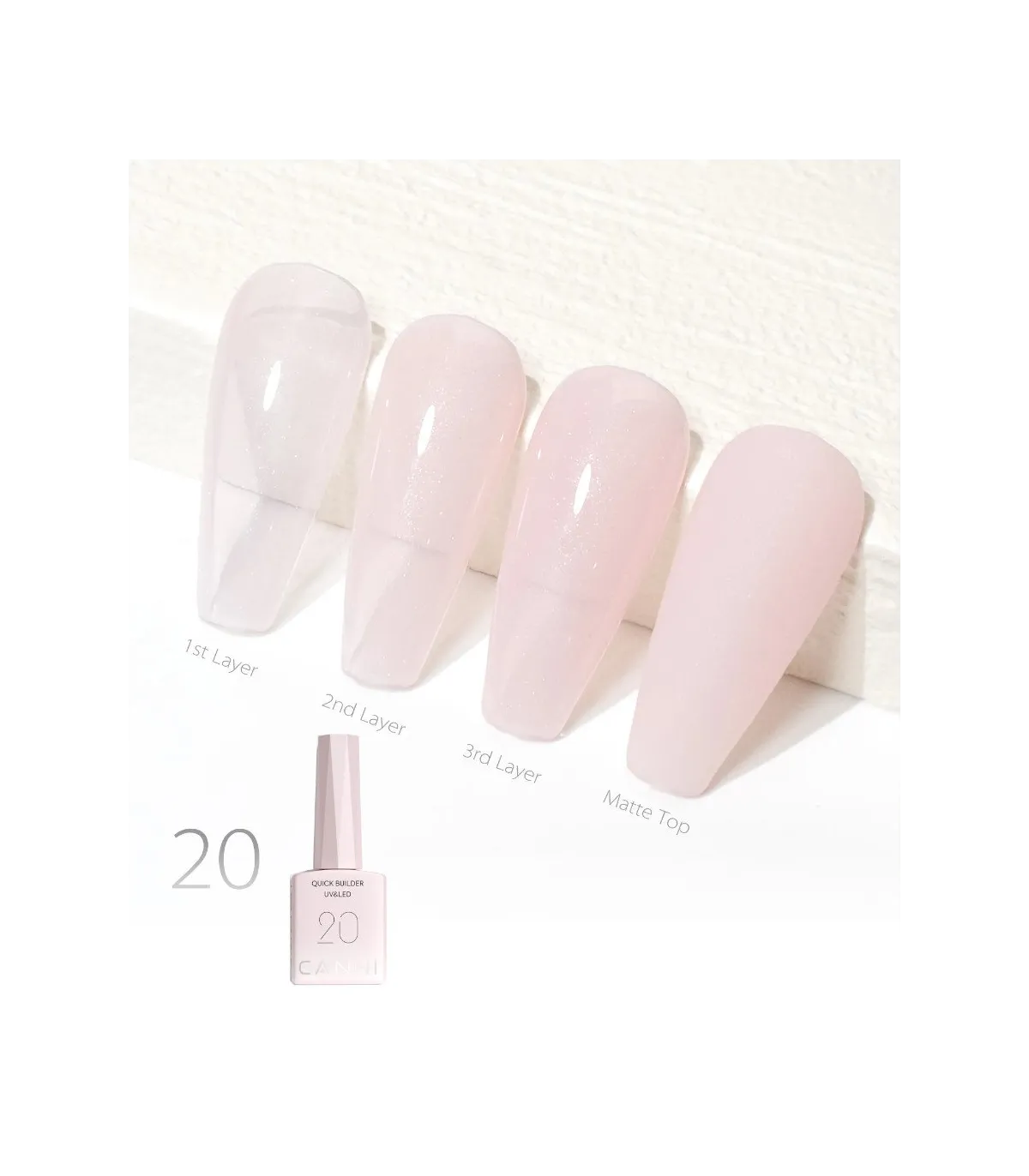 Gel constructor rápido X20 de CANNI es ideal para trabajar sobre la uña natural o con molde, y permite realizar manicuras resistentes, con volumen y un acabado sutil y pulido, sin necesidad de aplicar esmalte permanente después. Este gel constructor en formato botella con pincel de 9ml permite una aplicación precisa y rápida.