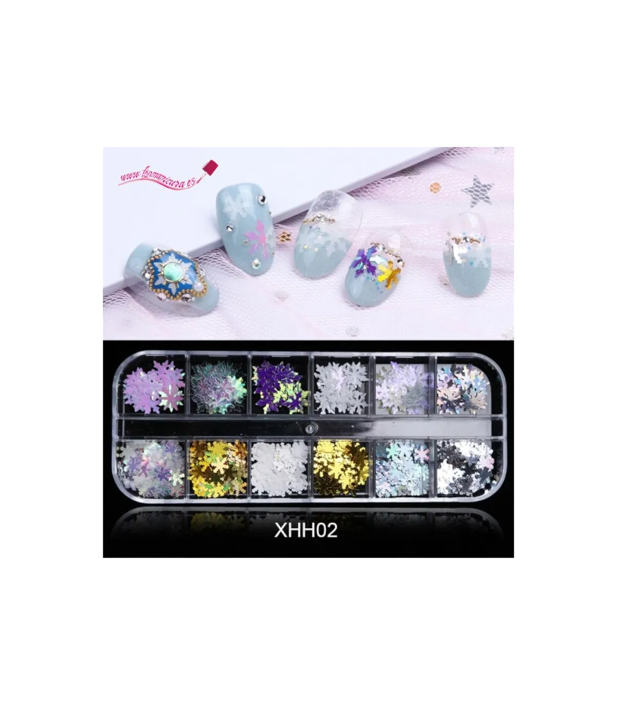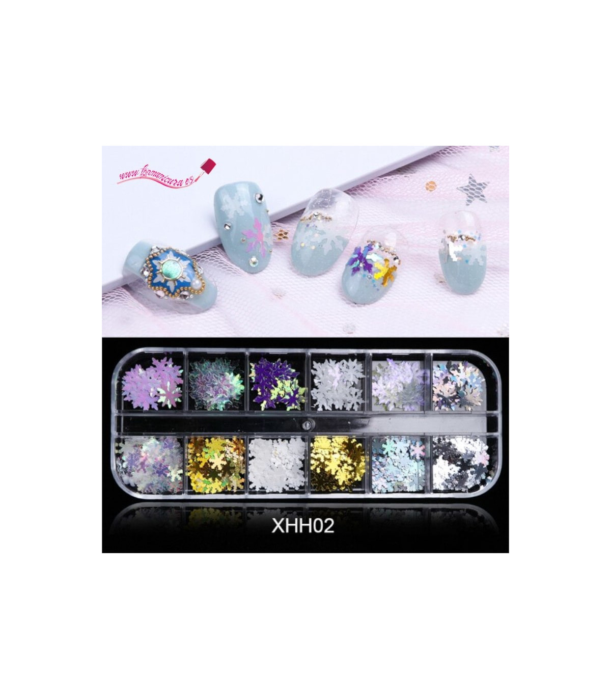Pack purpurina uñas copo nieve holograficos con 12 colores holográficosy con formas de copos de nieve y que podrás crear diseños de uñas muy bonitos y diferentes para estas fiestas de navidad.